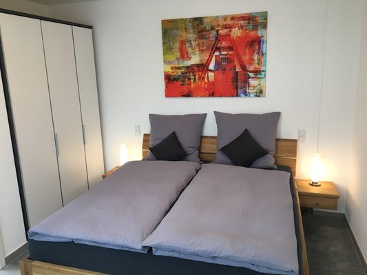 Das Zimmer ist mit einem hochwertigen Doppelbett in der Größe 1,80 m x 2,00 m mit Nachtisch und Nachtischleuchte ausgestattet.
