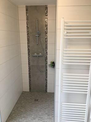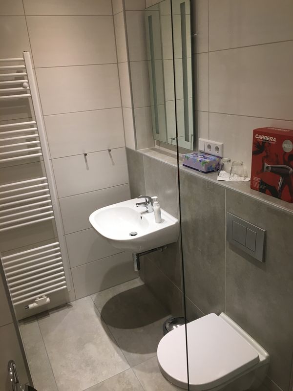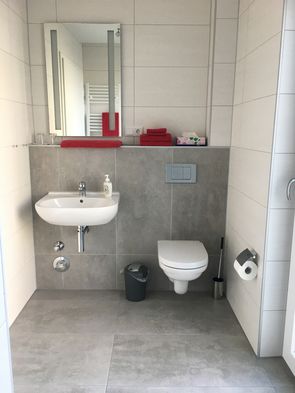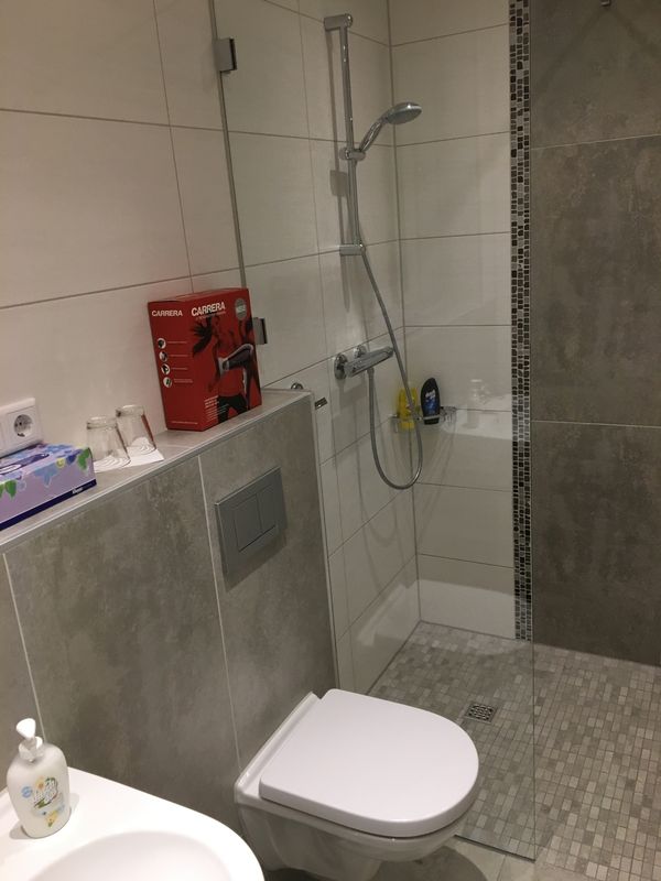 Im Bad befinden sich eine ebenerdig begehbare Dusche, ein Waschbecken, eine Toilette, ein Handtuch-Heizkörper, eine Ablage und ein beleuchteter Spiegel. Zusätzlich fällt am Tag und bei geöffneter Rollade viel Licht durch das schöne helle Milchglasfenster in jeden Winkel des Bades. Ein Fön liegt zur Benutzung bereit.